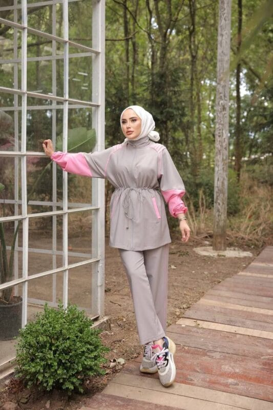 طقم رياضي محتشم من دوبل كريب قطني ‐ بتفاصيل أنيقة وسحّاب أمامي