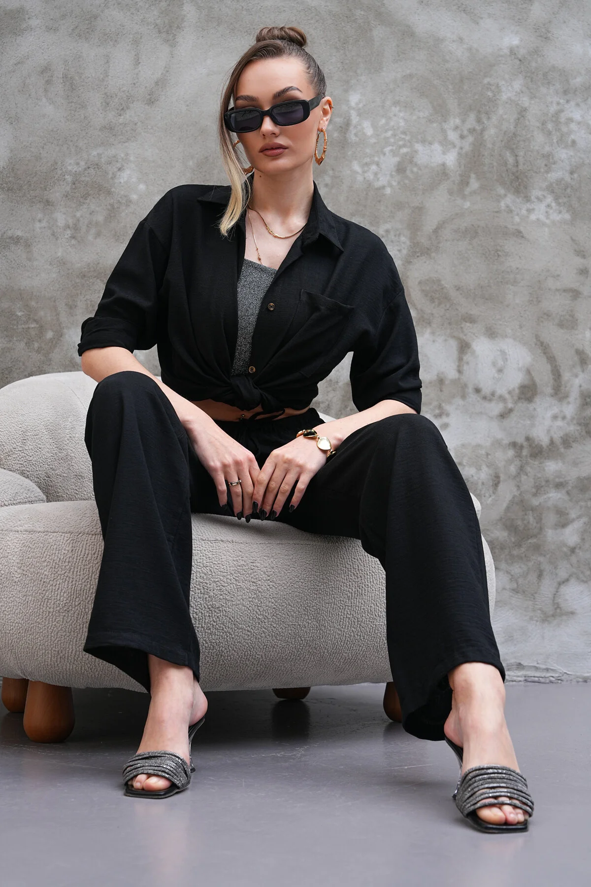 The loose-fit silhouette and natural texture give it a stylish minimalist vibe, making it ideal for casual outings, travel, or brunch with friends. Pair it with a crop top or simple tank for a versatile, easygoing look. Available in black, beige, navy, and olive green.