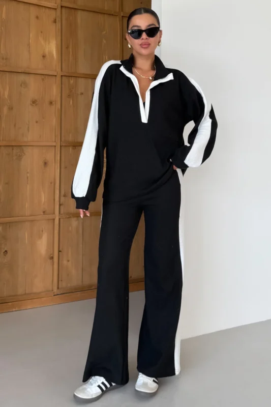 Women’s Two-Piece Color Block Tracksuit Set – Long Sleeve Zip Pullover & Wide-Leg Pants