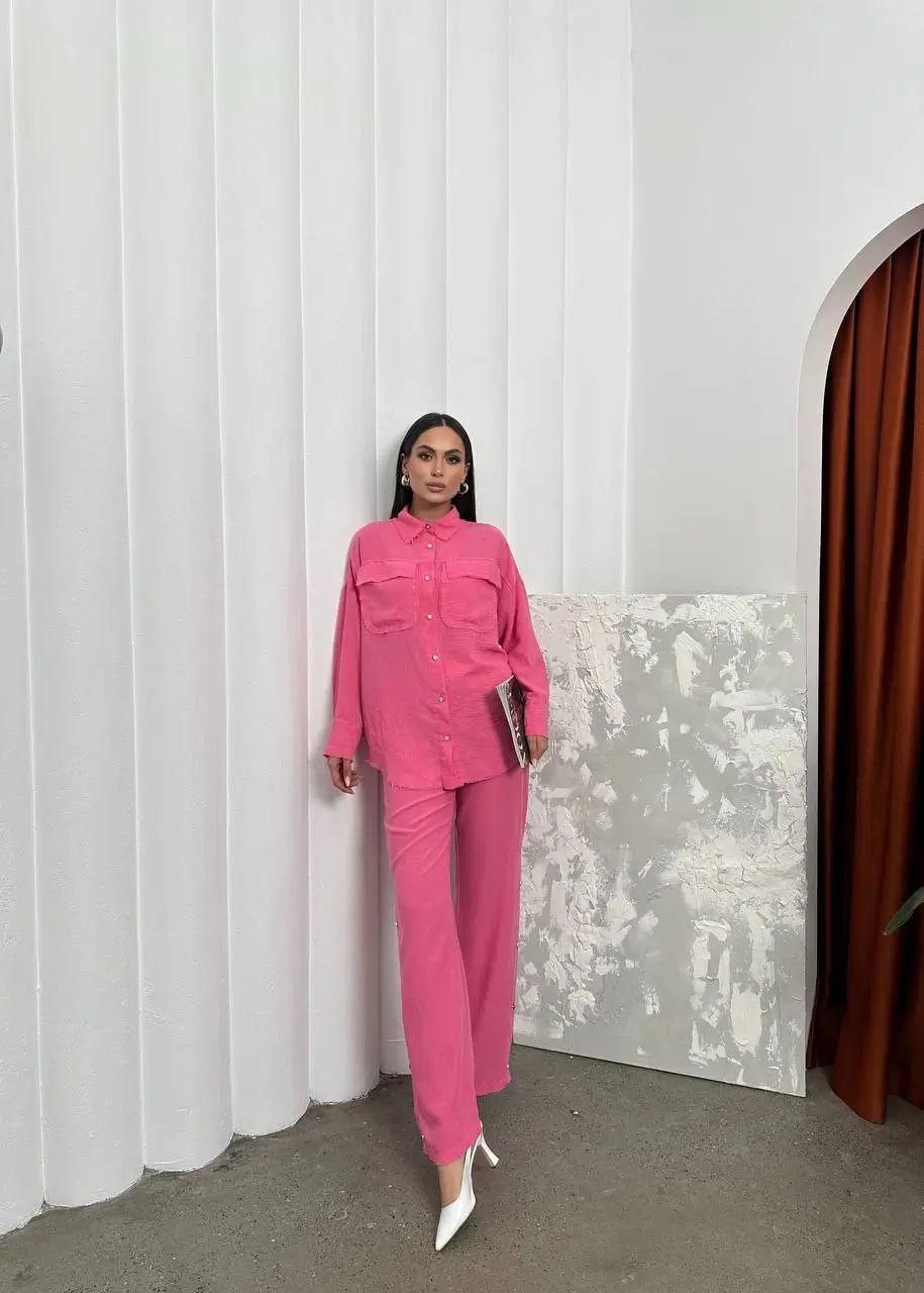 Refresh your style with this linen two-piece set, crafted for women who value both comfort and elegance. The set includes a button-down blouse with front pockets and matching straight-cut trousers, all made from breathable linen fabric that feels soft and lightweight. Perfect for everyday wear, casual gatherings, or even chic workdays, this outfit offers a relaxed fit while maintaining a polished look.